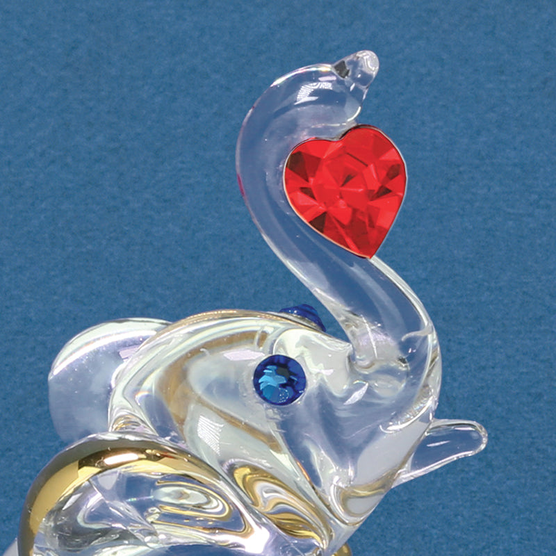• Handcrafted glass elephant figurine holding a red crystal heart, placed on a hand beveled glass mirror.