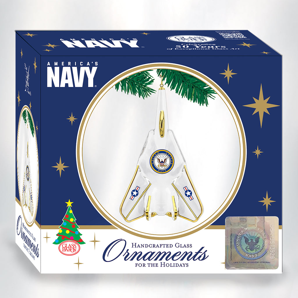 • Handcrafted glass ornament of a Navy F-14 Jet with classic U.S. Navy Emblem, hanging by a gold ribbon