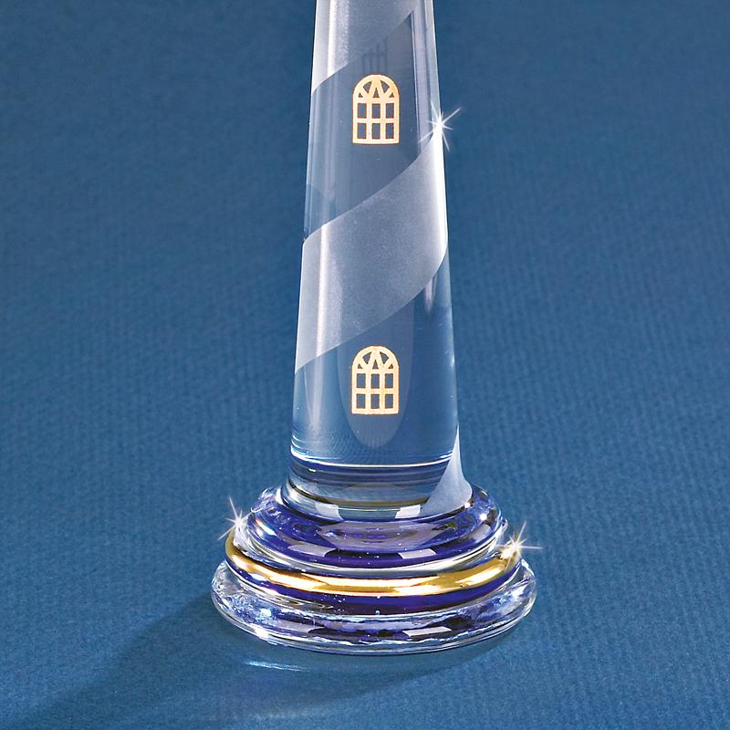 • Handcrafted glass lighthouse decorated with an etched spiral, accented with cobalt blue glass top and bottom
