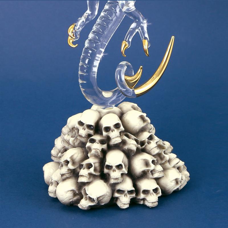 • Handcrafted figurine of dragon holding a skull on a pile of skulls