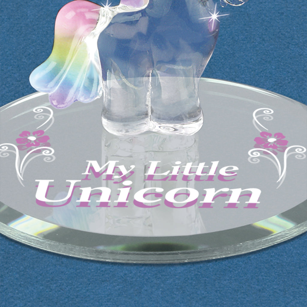 • Handcrafted glass unicorn, placed on a hand beveled glass mirror